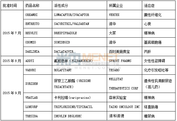 表1 2015年第三季FDA批準(zhǔn)的新分子實(shí)體