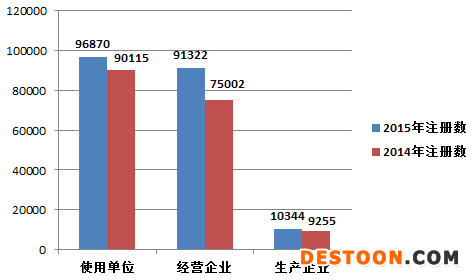 2015年,注冊(cè)基層用戶(包括醫(yī)療器械生產(chǎn)企業(yè)、經(jīng)營(yíng)企業(yè)和使用單位)總數(shù)比2014年增長(zhǎng)了13.9%。其中,醫(yī)療器械生產(chǎn)企業(yè)、經(jīng)營(yíng)企業(yè)和使用單位的注冊(cè)基層用戶分別比2014年增長(zhǎng)了11.8%、21.8%和7.5%(圖1-5)。