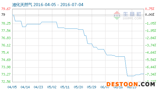 7月3日液化天然氣商品指數(shù)為73.34,與昨日持平,較周期內(nèi)最高點130.44點(2013-12-15)下降了43.77%,較2016年06月26日最低點73.16點上漲了0.25%。(注:周期指2012-09-01至今)