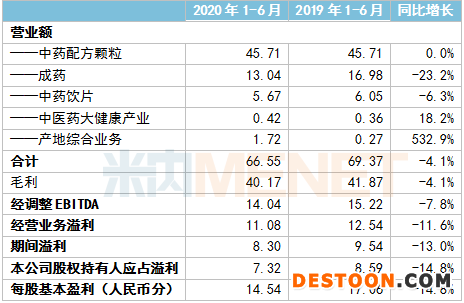 上半年,中國中藥實(shí)現(xiàn)營業(yè)收入66.55億元,同比下降4.1%。其中,中藥配方顆粒業(yè)務(wù)營業(yè)收入45.70億元,占總收入68.7%;中成藥業(yè)務(wù)營業(yè)收入13.04億元,占總收入19.6%;中藥飲片業(yè)務(wù)營業(yè)收入5.67億元,占總收入8.5%;中醫(yī)藥大健康業(yè)務(wù)營業(yè)收入0.42億元,占總收入0.6%;產(chǎn)地綜合業(yè)務(wù)營業(yè)收入1.72億元,占總收入2.6%。