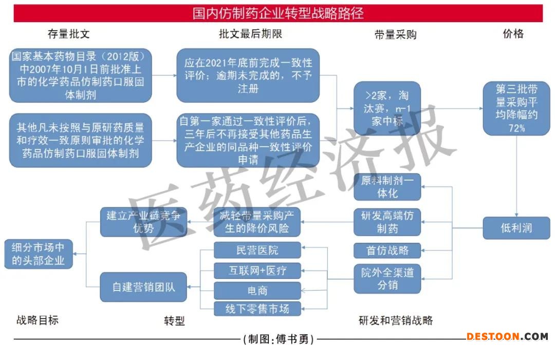 從國(guó)辦發(fā)〔2016〕8號(hào)文可知,屬于2012版《國(guó)家基本藥物目錄》中的產(chǎn)品,必須在2021年完成一致性評(píng)價(jià),否則不再注冊(cè)。按照我國(guó)仿制藥一致性評(píng)價(jià)所用時(shí)限約一年左右,這類產(chǎn)品距離最后期限還有15個(gè)月左右的時(shí)間,若現(xiàn)在還未進(jìn)行一致性評(píng)價(jià),遲早也要退出市場(chǎng)。根據(jù)食藥總局公告2016年第106號(hào)文,其他化學(xué)藥品仿制口服固體制劑若第一家通過(guò)一致性評(píng)價(jià),注冊(cè)受理工作三年后也會(huì)“自動(dòng)關(guān)門”。長(zhǎng)痛不如短痛,對(duì)一些中小制藥企業(yè)而言,現(xiàn)有品種不可能通過(guò)一致性評(píng)價(jià),未來(lái)必然退出市場(chǎng)。既然看不到希望,為何不換個(gè)方向?