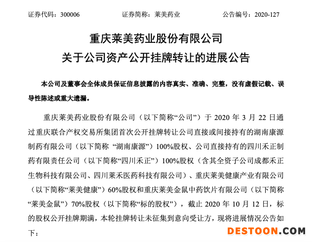 10月14日,萊美藥業(yè)發(fā)布公告,披露公司公開掛牌轉(zhuǎn)讓4家子公司的進展。公告顯示,截至2020年10月12日,標(biāo)的股權(quán)公開掛牌期滿,本輪掛牌轉(zhuǎn)讓未征集到意向受讓方。也就是說,經(jīng)歷了8次掛牌,萊美藥業(yè)轉(zhuǎn)讓子公司股權(quán)仍然難覓買家。