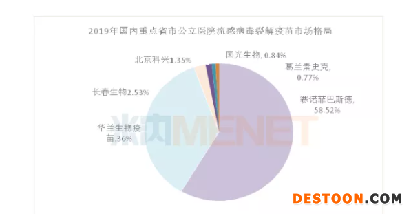 2019年國內(nèi)重點省市公立醫(yī)院疫苗市場超過3億元,同比上一年增長超過30%,其主要品種仍是人用狂犬病疫苗、人乳頭瘤病毒疫苗、肺炎球菌多糖疫苗占據(jù)了前3位,分別占55.81%、20%、6.14%,而流感病毒裂解疫苗、四價流感病毒裂解疫苗和流感病毒亞單位疫苗占1.5%。