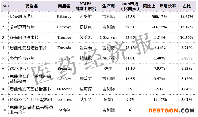 據(jù)跨國(guó)公司財(cái)報(bào),2019年全球抗HIV藥物終端市場(chǎng)為323億美元,同比上一年增長(zhǎng)率為3.41%。其中抗HIV藥物TOP10占據(jù)了該領(lǐng)域70%以上的市場(chǎng)。