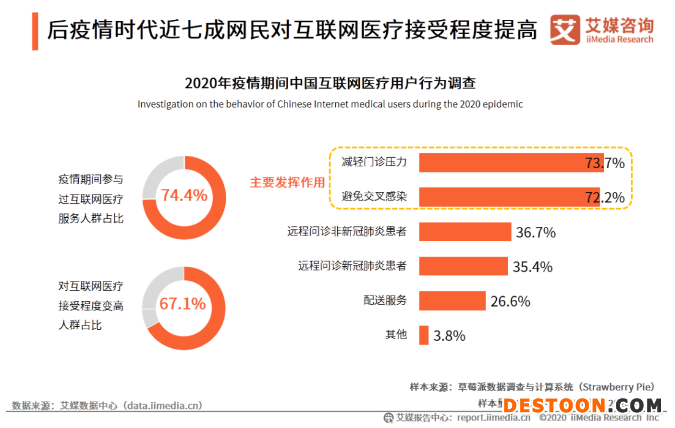 2020年新冠疫情影響下,居民對于醫(yī)藥電商、互聯(lián)網(wǎng)醫(yī)療平臺使用需求進(jìn)一步提升。艾媒咨詢數(shù)據(jù)顯示,74.4%的中國網(wǎng)民在疫情期間參與過在線問診、醫(yī)藥電商或互聯(lián)網(wǎng)健康咨詢等互聯(lián)網(wǎng)醫(yī)療服務(wù),67.1%的網(wǎng)民表示對互聯(lián)網(wǎng)醫(yī)療接受程度有所提升。