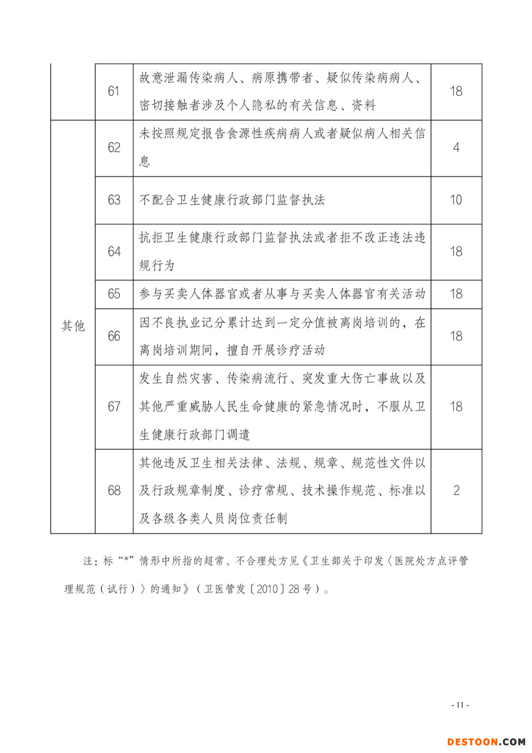 (一)醫(yī)師不良執(zhí)業(yè)行為記分累計(jì)達(dá)到10分、不滿14分的,離崗1個(gè)月;