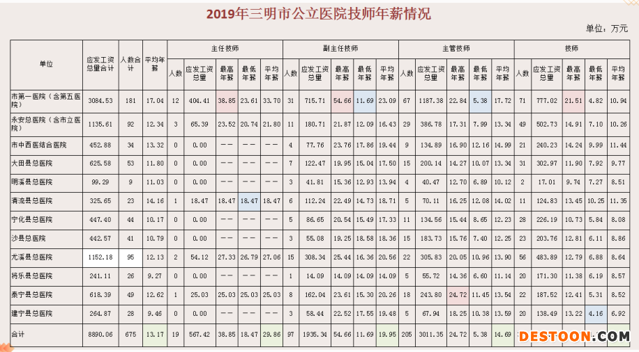 數(shù)據(jù)顯示,2019年三明市12家總醫(yī)院主任醫(yī)師年薪最高近60萬元,最低15萬元,平均30萬元;副主任醫(yī)師最高年薪55萬元,最低10萬元,平均年薪21萬;主治醫(yī)師最高41萬元,最低7.8萬元,平均15萬元;住院醫(yī)師最高29萬元,最低4萬元,平均約11萬元。