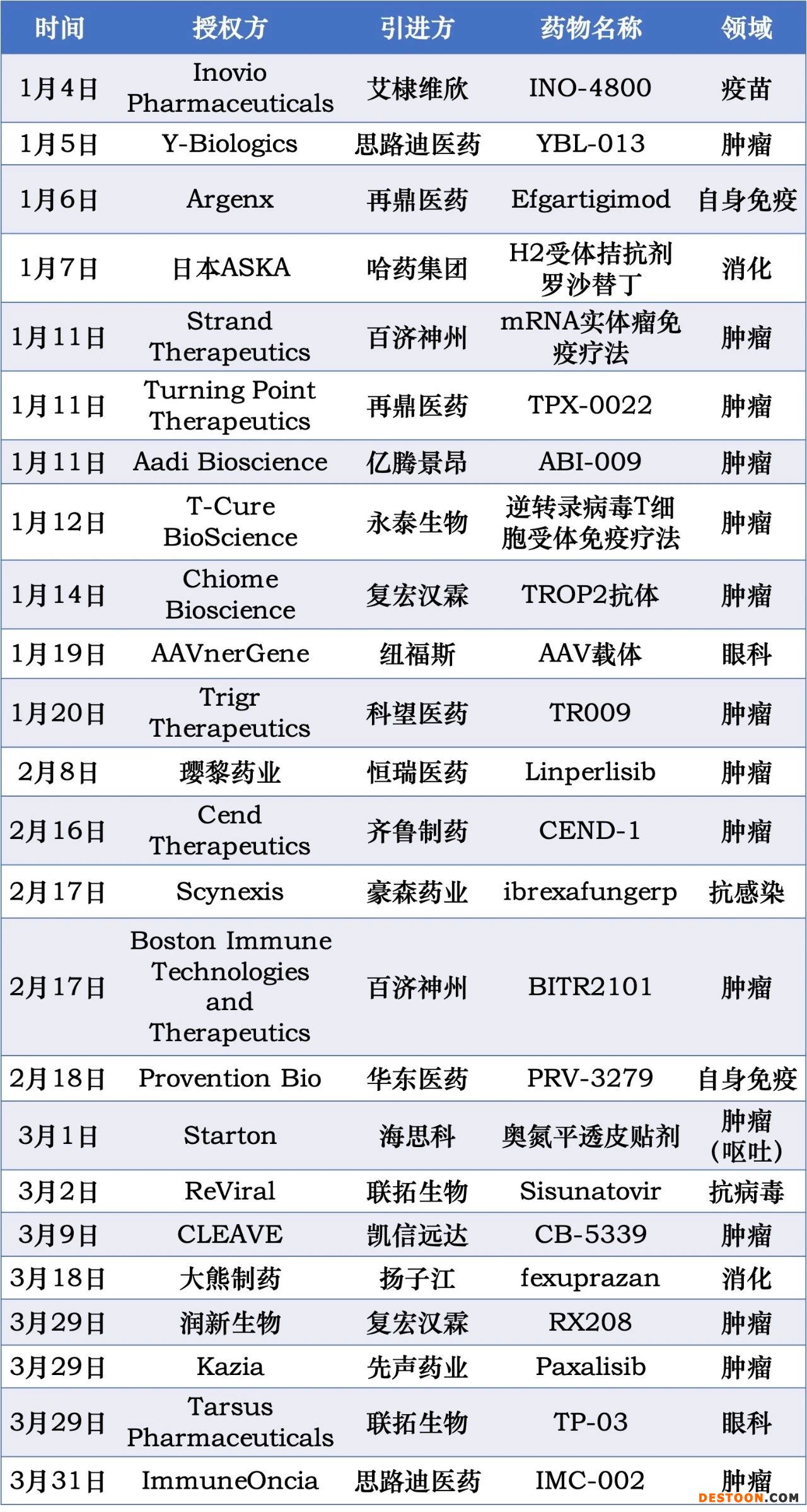 2021年1月-3月,經(jīng)過梳理發(fā)現(xiàn),中國本土醫(yī)藥創(chuàng)新企業(yè)仍然是License-in的核心力量,包括百濟(jì)神州、再鼎醫(yī)藥、復(fù)宏漢霖、思路迪醫(yī)藥等在內(nèi)的一批頭部Biopharma/Biotech公司,在2021年開年便火力全開。